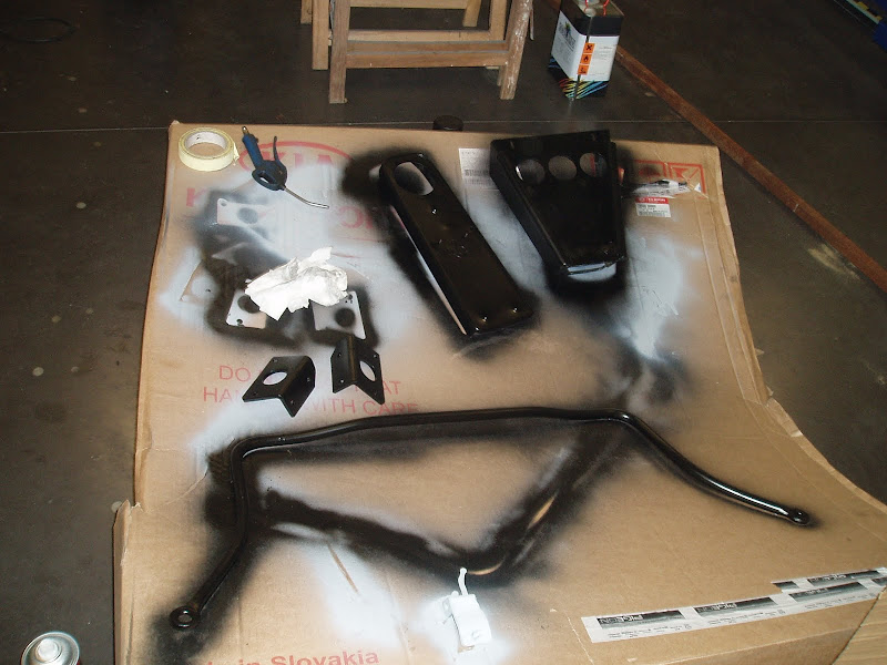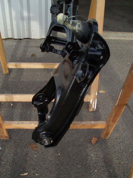 La semaine dernière, j'ai fait démonter à l'apprenti les triangles de la Kadett blanche épave et on a du coup tout préparer à l'avance pour les triangles (qui eux ont les fixation pour la barre stab avant). Ils étaient dans un état déplorable. les voici maintenant avec nouvelles douilles, silent-blocs et rotules mis en place :